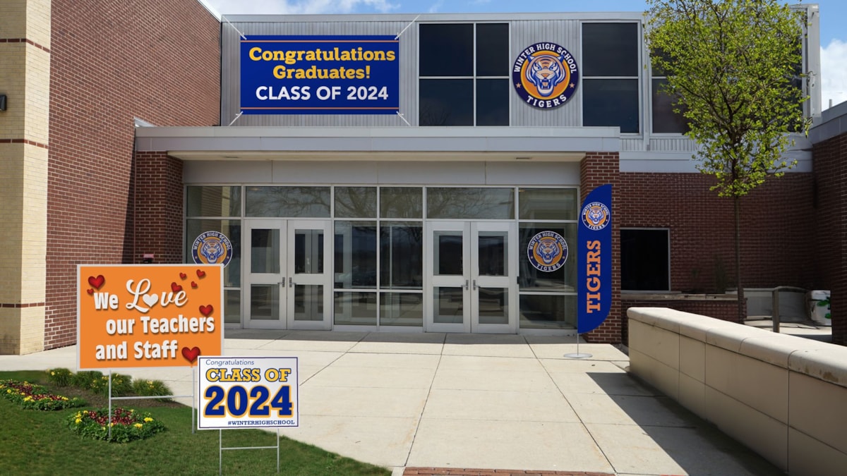 - Yard Signs:Versatile, portable, and easy to set up, yard signs can be customized with your school’s colors and logos. Whether you want a display for your own property or something to spread throughout the community, we have the solution for you.