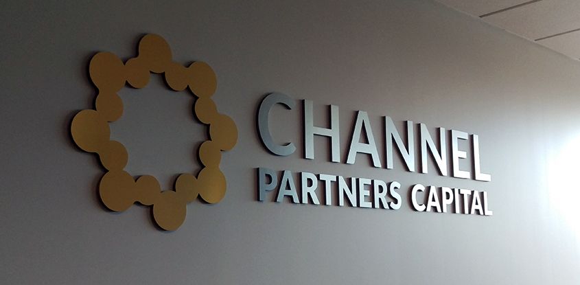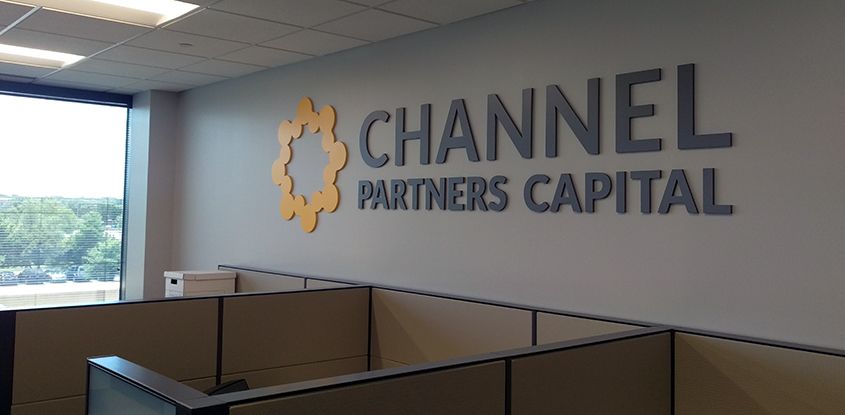 Dimensional logos and etched vinyl graphics for Channel Partners' new space in the Twin Cities.